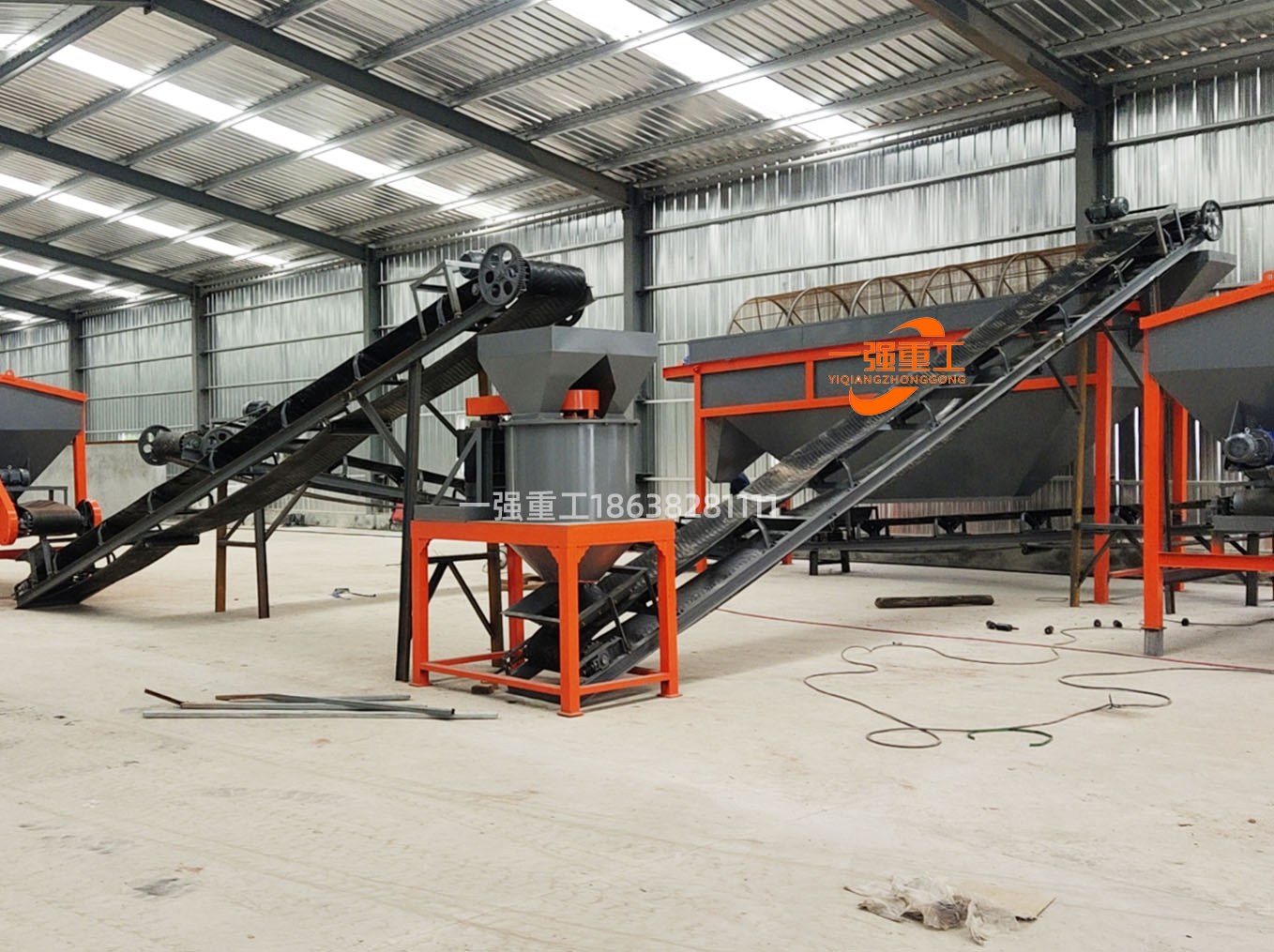 粉状有机肥生产线:发酵翻堆机、铲车料仓、粉碎机、筛分机、包装机。